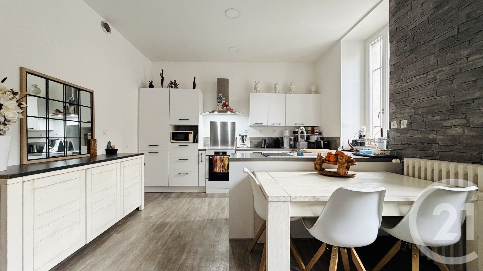 La pièce de vie, composée d'un séjour avec cuisine ouverte de 32.27 m², offre un cadre convivial et élégant, révélant tout le cachet de l'ancien et une atmosphère chaleureuse.